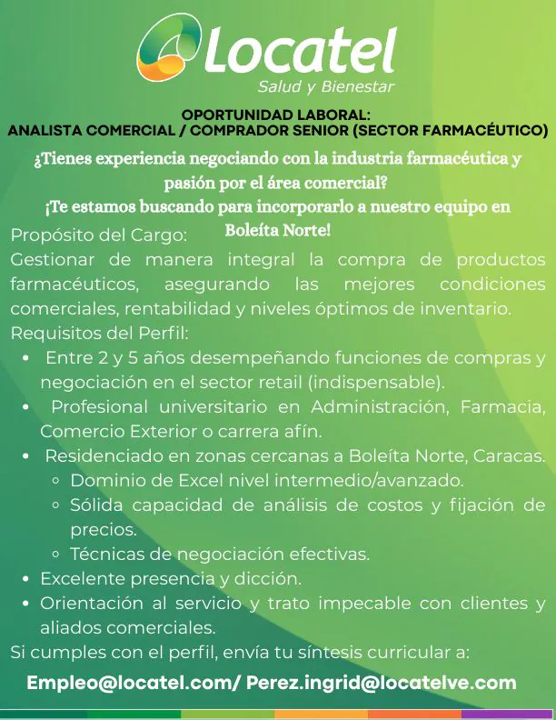 Información para postularse: Los interesados que cumplan con el perfil favor enviar su síntesis curricular al correo electrónico: empleo@locatel.com, perez.ingrid@locatelve.com indicando en el asunto: Bolsa de trabajo IESA- Comprador Senior – [Nombre del Candidato].