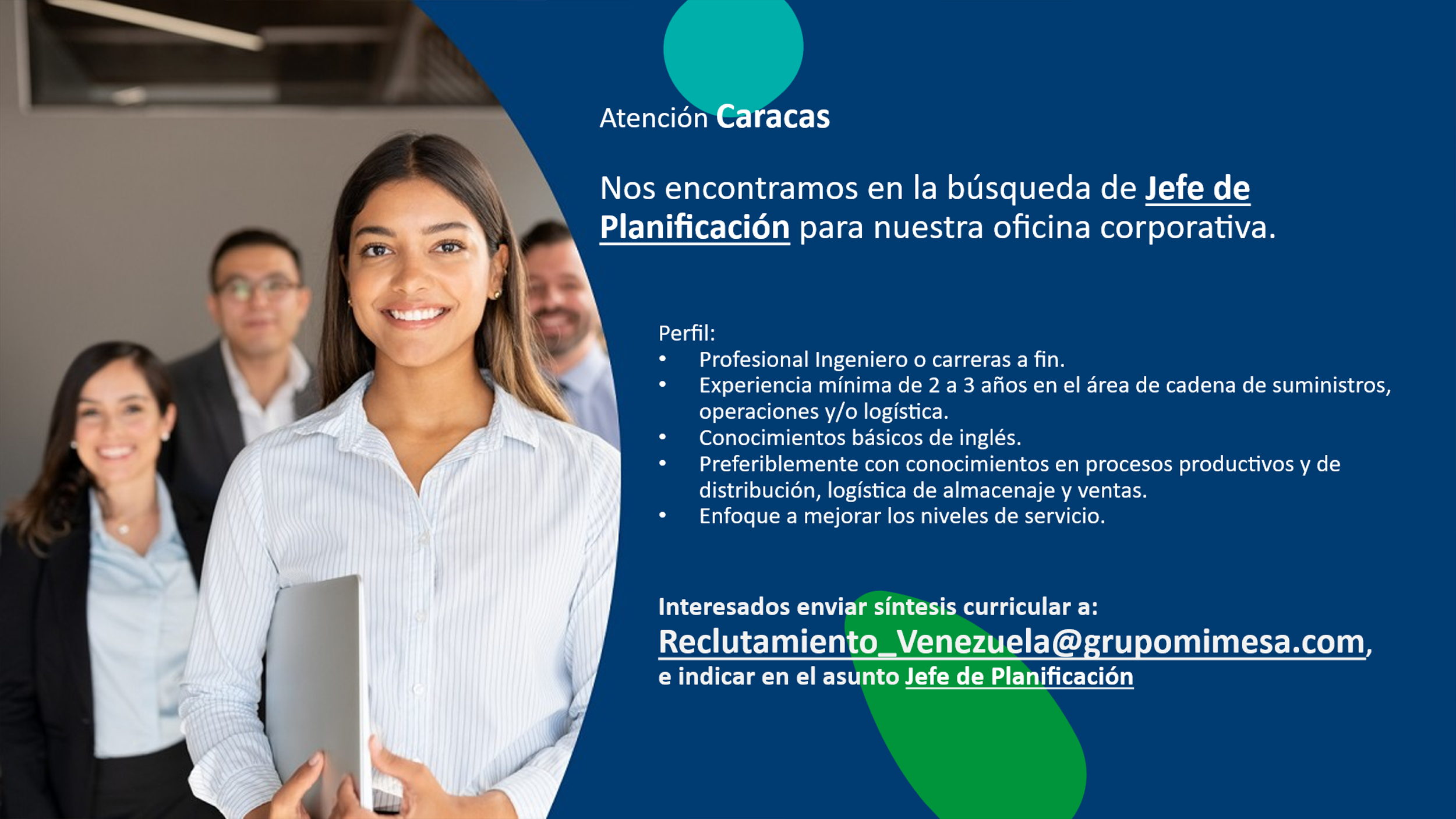 Enviar los CVs con el asunto Jefe de planificación– BOLSA DE TRABAJO IESA, al siguiente correo: reclutamiento_venezuela@grupomimesa.com