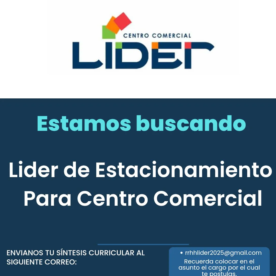 Si cumples estos requisitos Envíanos tu síntesis curricular al correo electrónico rrhhlider2025@gmail.com con el asunto: Bolsa de trabajo IESA- LIDER PARA ESTACIONAMIENTO DE CENTRO COMERCIAL- [Nombre del postulado].