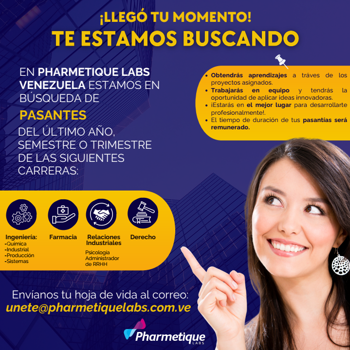 Para aplicar a la vacante envía tu cv al siguiente correo: unete@pharmetiquelabs.com.ve